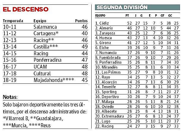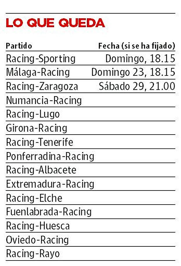 De pronto el Racing cree de nuevo en sí mismo. Tras la pequeña catarsis que han significado el cambio de entrenador, la llegada ... de cinco caras nuevas, la salida al paso de los propietarios y el echar a un lado a Chuti Molina, la victoria del viernes, que era lo único que de verdad podía empezar a taponar la hemorragia, ha provocado que el equipo y su masa social vuelvan a confiar en que la permanencia es posible. Para ello los verdiblancos tienen un reto: ganar más de la mitad de los partidos que quedan. Para más señas, ocho de quince para sumar 48 puntos (ahora cuentan con 24) que en circunstancias normales aseguran seguir en la categoría. Cierto es que en ocasiones la permanencia ha estado algo más cara (se llegó a descender con 50), pero han sido casos excepcionales y en esta temporada seguir en Segunda División parece que va a estar más barato, según el promedio actual de puntos. Además, el posible descenso administrativo del Málaga dejaría en solo tres las plazas a evitar, despejando ligeramente el camino a los equipos implicados en la lucha por evitar el descenso.