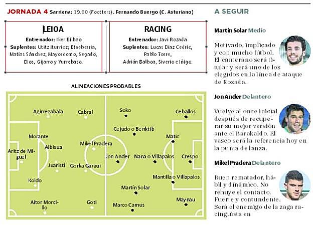 Sea como fuere, lo cierto es que a ambos conjuntos les ha dado tiempo para estudiarse porque debían haberse enfrentado hace un mes y lo harán hoy, entre semana y en un día de escuela, porque así lo decidió el Comité de Competición tras ser aplazado el duelo por el confinamiento de la plantilla vizcaína. De esta manera, si a alguno le sorprende lo que ponga su rival en el examen de hoy sería un error no forzado. En eso, el Leioa lo tiene más fácil porque el quehacer del Racing es 'vox populi', mientras que para enterarse de lo que hace el modesto club estudiantil se exige un ejercicio de compromiso tenaz. Para Rozada «el equipo ya se reivindicó en casa y ahora toca hacerlo fuera». En cualquier caso, para lo de hoy, a Iker Bilbao, el entrenador del Leioa, no le será difícil imaginar que su colega de banquillo después de que por fin le convenciese el equipo que ganó al Barakaldo (3-0) no lo va cambiará Fue su tercera propuesta en cinco días y de una vez por todas se marchó convencido del campo. Ahora bien, el asturiano aseguró ayer que «para seguir bien tenemos que ser reconocibles». Con ello quiso decir que en propuesta y planteamiento parece que se planta, que no va a inventar más –al menos por ahora–. Eso sí, lo que adelantó fue que los nombres serían otros. De ahí que Villapalos, Nana, Jon Ander, Benktib y, por supuesto, Martín Solar, tienen hoy una posibilidad más que probable de jugar de inicio.