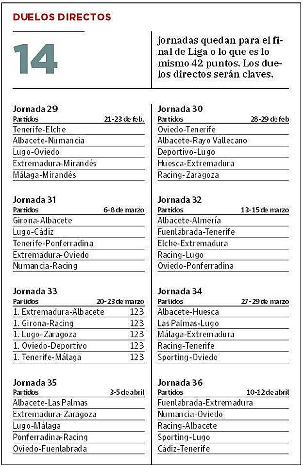 A sus rivales actuales -aunque es complicado señalarles de manera definitiva a catorce jornadas del final- les ocurre algo similar. Todos tienen ante sí la posibilidad de escapar de la quema por sus propios medios -es decir, ganando partidos- y todos ellos tienen enfrentamientos directos en las próximas jornadas. El que puede aclarar su futuro cuanto antes puede ser el Oviedo, que se mide al Lugo, Tenerife y Extremadura de manera consecutiva a partir de este fin de semana. Los carbayones están a un punto de la salvación actualmente y le sacan cinco de ventaja al Racing. Sus tres próximos partidos son decisivos, tanto para el club asturiano como para las posibilidades de sus rivales, sobre manera gallegos y extremeños, que en estos momentos le persiguen en la clasificación. Valga como dato significativo que, si el Racing lograse mantener la esperanza de la permanencia hasta las últimas jornadas, precisamente en la penúltima el calendario emparejará al Oviedo y a los cántabros en el Carlos Tartiere. Un duelo que puede ser apasionante.