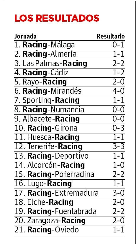 El Racing comenzó el campeonato dejándose puntos incomprensibles. Perdió con un Málaga que llegaba con solo diez profesionales en los últimos minutos (0-1), le empató el Almería (1-1) cuando ya se celebraba el triunfo, empató in extremis con Las Palmas (2-2, perdió con el Cádiz (1-2) en los últimos minutos, hizo tablas sufriendo en El Molinón (1-1), empató de modo cruel ante el Huesca (1-1) y vivió un festival de goles (3-3) ante el Tenerife. En aquel partido hubo de todo, porque jugó al primera peor parte de la Liga y acabó empatando sobre el pitido final. Ante el Dépor el Racing pidió la hora (1-1), ante la Ponfe tuvo suerte y sumó un punto cuando ya se marchaba el público y ante el Lugo ocurrió al revés: se dejó empatar cuando Cristóbal casi festejaba su debut victorioso (1-1). Una auténtica montaña rusa. El Racing no ha ganado ni un solo partido que no haya merecido. De hecho los dos en lo que puntuó de tres fue ante el Mirandés (4-0) y ante el Extremadura (3-0). Difícilmente se puede sacar la cabeza en una situación tan poco propicia.
