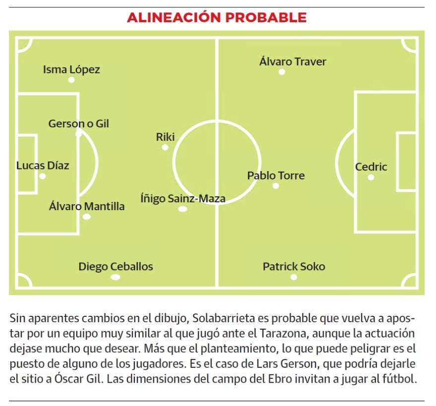 No ha habido tiempo para entrenar tácticamente el partido, salvo los dos últimos días en los que a puerta cerrada el cuerpo técnico ha aprovechado para «estar solos y alejarse del ruido». El míster, además de esconder lo que planea para no dar ventajas al Ebro definió la decisión de esconderse tras los muros de La Albericia como algo que «se necesitaba». Así las cosas, y sin que haya dado pistas, no parece que tenga pensado modificar el dibujo con el que el equipo jugó en Tarazona, aunque es probable que ese partido le pueda costar el puesto a algún jugador. En ese sentido, la actuación de Lars Gerson, que debutó como titular ante los aragoneses, dejó mucho que desear. Óscar Gil podría recuperar el sitio que el luxemburgués le arrebató. Ahora bien, después de lesiones y viajes con la selección, tampoco se descarta que Solabarrieta mantenga pese a todo la confianza en el central internacional.