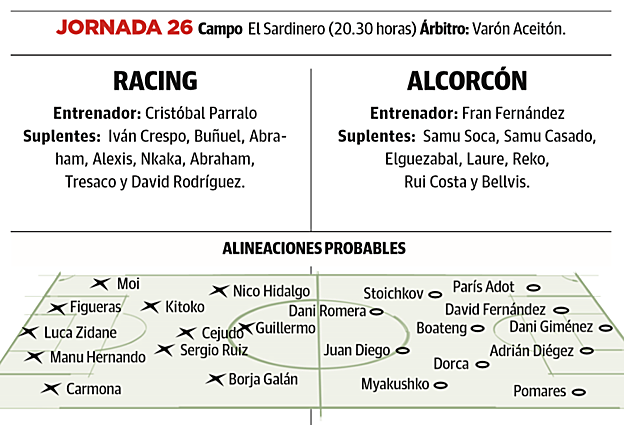 Y este domingo ante el Alcorcón (El Sardinero, 20.30 horas), ya con el mercado de invierno en la nebulosa de los malos sueños, el equipo tiene la posibilidad de pasar de las palabras a los hechos. 'De las tres hijas de Elena... Dos al 'prao'. En la lista de Cristóbal entraron en la convocatoria del sábado Guillermo y Borja Galán a Nando porque no le dio tiempo -llegó en la noche del sábado a Santander y este domingo verá el partido desde la grada-. El delantero ha jugado buena parte de esta Liga con el Numancia (16 partidos), está en buena forma, entrenó el viernes con el equipo y hoy será titular. Es más que presumible. Con Galán pasa más de lo mismo, ¿para qué esperar? Está disponible y con Lombardo lesionado todo hace indicar que tiene pista libre para debutar.