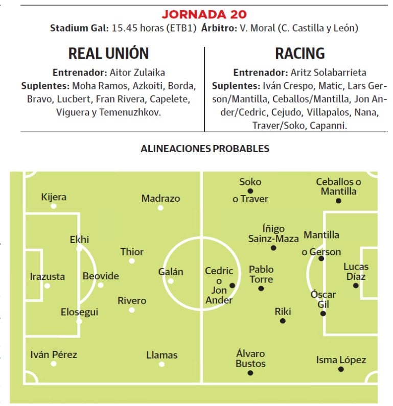 Y por eso puede usar el plan A o el B. Si opta por ser continuista sobre el verde desfilará el once que se ha ganado la titularidad en las últimas jornadas. En la portería Lucas Díaz, que precisamente arrebató el puesto bajo palos al veterano Iván Crespo tras una mala actuación del de Viveda en el choque ante el Real Unión en El Sardinero. Para conformar el muro verdiblanco Mantilla y Óscar Gil en el centro de la zaga y en los laterales Ceballos por la derecha e Ismael López en el carril izquierdo. En el centro del campo la pareja formada por Íñigo Sainz-Maza y Riki es prácticamente indiscutible. La presencia del asturiano a los mandos de la sala de máquinas es obligada, y lo ha demostrado de sobra desempeñando un papel fundamental en el renacer del equipo verdiblanco. En las bandas Soko por la derecha y Álvaro Bustos por la izquierda, son los puñales más afilados con que cuenta Solabarrieta para rasgar la defensa del equipo fronterizo. Pablo Torre en la media punta y Cedric como delantero. Hasta aquí el Plan A. Pero por lo que el entrenador vizcaíno ha dejado ver esta semana en los entrenamientos, un Plan B puede entrar en escena. Cambios sutiles, pero contundentes. El Real Unión domina a la perfección el balón parado y el juego aéreo. Por eso el técnico podría dar entrada a Lars Gerson en el centro de la zaga y desplazar a Mantilla al lateral derecho en detrimento de Ceballos. Con esto reforzaría la defensa y ganaría más duelos aéreos en un campo siempre difícil y ante un rival acostumbrado a imponer su ley en casa.