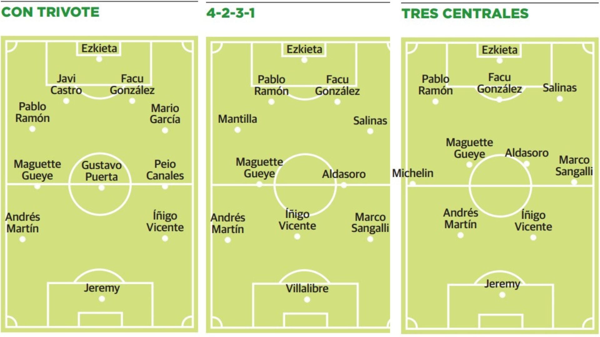 Las posibilidades son casi infinitas, pero hay tres propuestas principales en el catálogo de sistemas de José Alberto está temporada:el tradicional 4-2-3-1; el dibujo con tres centrales que ha utilizado en momentos desfavorables y el nuevo trivote, que tan buen resultado le dio el domingo ante el Deportivo.