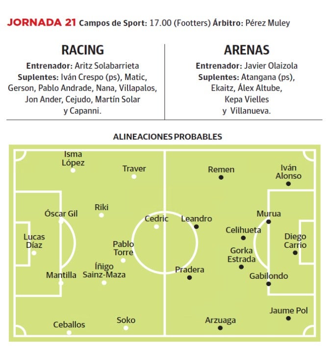 Un Arenas que se juega la permanencia y que está liderado en ataque por uno de Colindres, Leandro, que tuvo las Instalaciones Nando Yosu de La Albericia como casa. Seguro que sabe a la perfección dónde se le puede hacer daño a este Racing lejos aún de ser un bloque sólido.