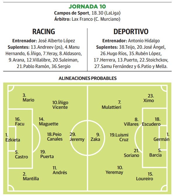 En cuanto a la alineación, resulta complejo prever qué dos centrales alineará JAL, descartada como parece en casa y con las bajas en las bandas la defensa de cinco. Pablo Ramón y Facu González fueron los elegidos en Gijón, pero no les fue bien. Más allá del tanto del empate que anuló Orellana en plena jugada, casi cuando Mario García armaba la pierna, la derrota ante el Sporting fue, por juego y reparto de méritos, justa. Son sin embargo los dos centrales que llegaron para reforzar y aportar visión de juego a la zaga; el corte de central que les gusta al técnico y a Chema Aragón, y han tenido ya su particular pretemporada y trabajo de adaptación tras su llegada con tres jornadas completadas (sobre la tercera, en el caso del balear). Sin embargo, Manu Hernando y, especialmente, Javi Castro, los titulares de los cuatro primeros partidos –pleno de victorias– también cuentan.