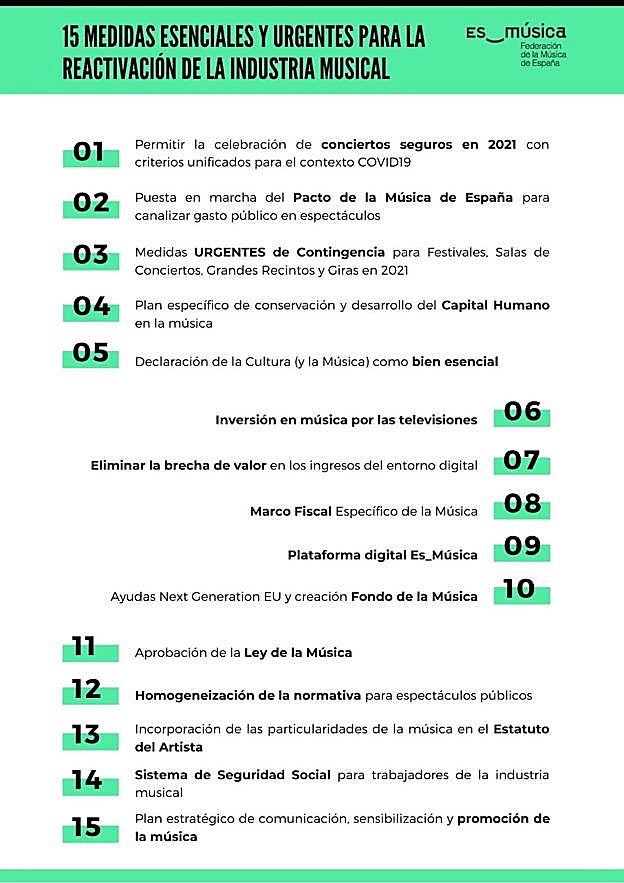 Las 15 medidas planteadas por Es_Música tienen una vocación propositiva y están diseñadas desde una visión global de la música como industria, en todas sus vertientes: música en directo, música grabada y composiciones. Suponen una solución tanto para las urgencias a corto plazo de trabajadores, profesionales y empresas de la música, como para el desarrollo a largo plazo de una industria musical española fortalecida y más competitiva.