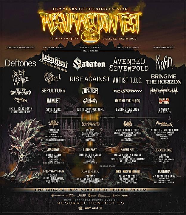 El evento, referente en su género, agradece así la fideliad de quienes han mantenido su entrada a pesar de los sucesivos aplazamientos generados por el covidA la lista de festivales que anuncian su próxima edición en 2022, se suma el Resurrection Fest. La organización ha comunicado que la mayoría de bandas siguen en el cartel, y se mantendrá la cabecera prevista: Avenged Sevenfold (fecha única en España y una de las pocas actuaciones en Europa el año que viene), KoRn (único festival en España), Judas Priest - 50 years (celebrando sus 50 años como uno de los referentes del heavy metal), Deftones y Sabaton (con la mayor producción que han tenido nunca en España), quienes serán los encargados de encabezar los cinco días de festival, junto con otras bandas como Bring Me The Horizon con una gran producción, Rise Against (único festival en España), Bullet For My Valentine u Opeth, que también brillarán con luz propia.