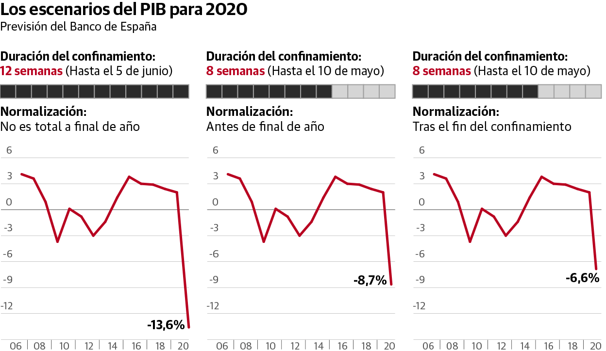 Desde un enfoque de la oferta, el Banco de España calcula que el PIB nacional podría retroceder hasta un 13,6% este año si el confinamiento dura 12 semanas y a fin de año la normalización aún no es total, sobre todo por las ramas ligadas a la hostelería y al ocio. En escenarios más positivos, en el que el confinamiento dure 8 semanas (el periodo que está previsto hasta el momento, del 14 de marzo al 9 de mayo), la caída de la economía será del 8,7% si se consigue una normalización antes de fin de año y del 6,6% si se consigue esta vuelta a la normalidad tras el confinamiento.