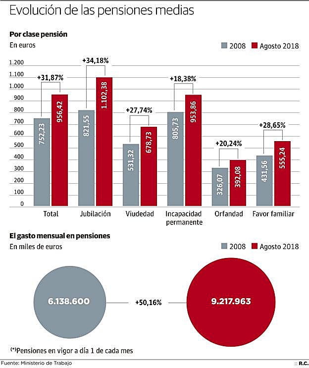 Si la factura sube es porque también lo hacen las pensiones, más de un 31% de media. En realidad, podría ser que creciera solo por haber más beneficiarios, pero en este caso se dan ambos factores: más pensionistas y pensiones más jugosas. De hecho, la prestación media ha subido en apenas una década más de 230 euros al mes, lo que supone un 31,8% más, al pasar de los 725 euros que recibía de media un pensionista en 2008 a los 956 euros que se mete ahora en el bolsillo.