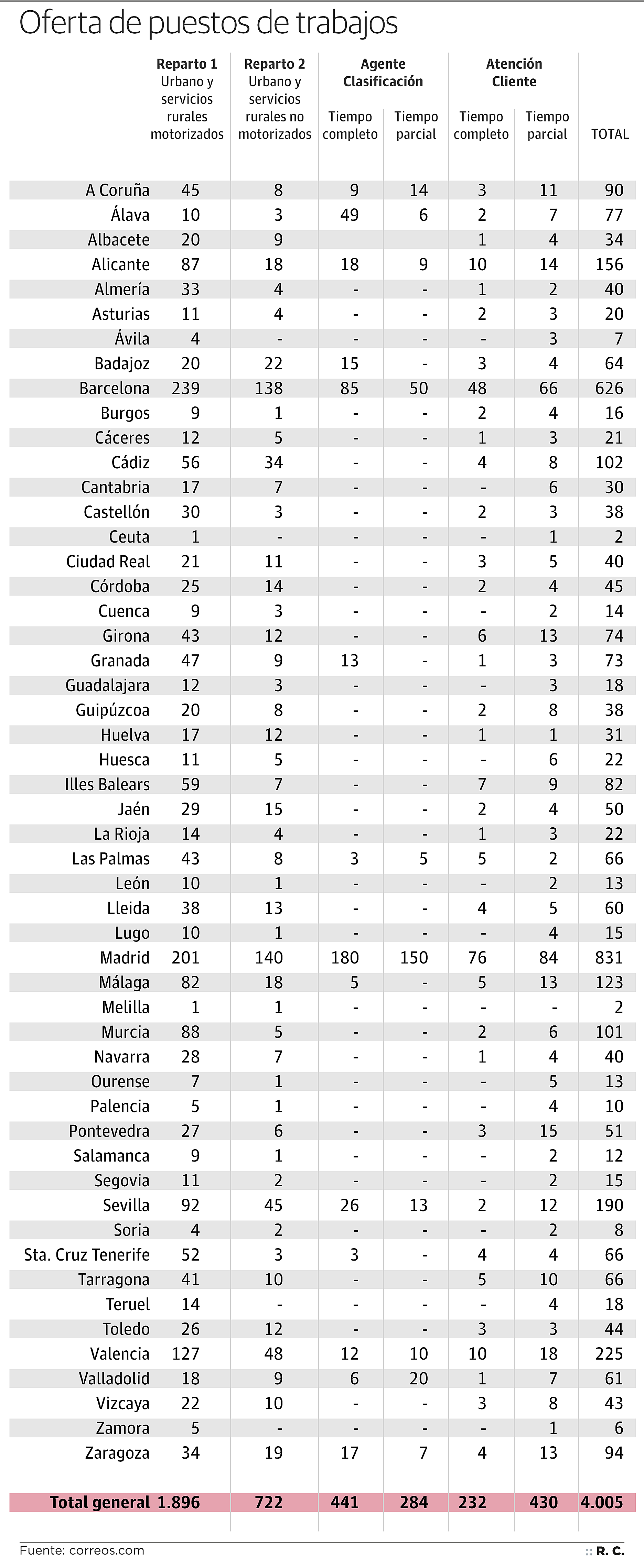 La actual convocatoria incluye la oferta de los puestos correspondientes a las tasas de reposición aprobadas para el año 2017 y 2018, así como 574 de los contemplados en el Acuerdo Plurianual 2018-2020. En concreto, 2.618 irán destinados a tareas de reparto, 725 para agente de clasificación y 662 para atención al cliente en oficinas.