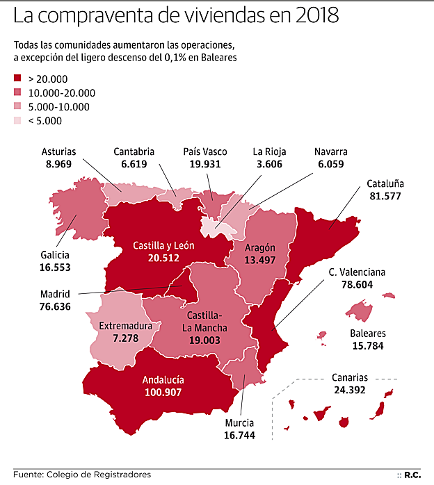 Cabe destacar también el ligero descenso de la compra de viviendas por parte de extranjeros en España el año pasado, alcanzando el 12,7% del total con 65.400 casas adquiridas, 15.000 menos que en 2017. Los que más compraron fueron los británicos (15,5%) pese a la incertidumbre del 'brexit', seguidos de alemanes, franceses, belgas, italianos y suecos. Sobre todo compran casas como segunda residencia en Baleares, Canarias y Comunidad Valenciana.