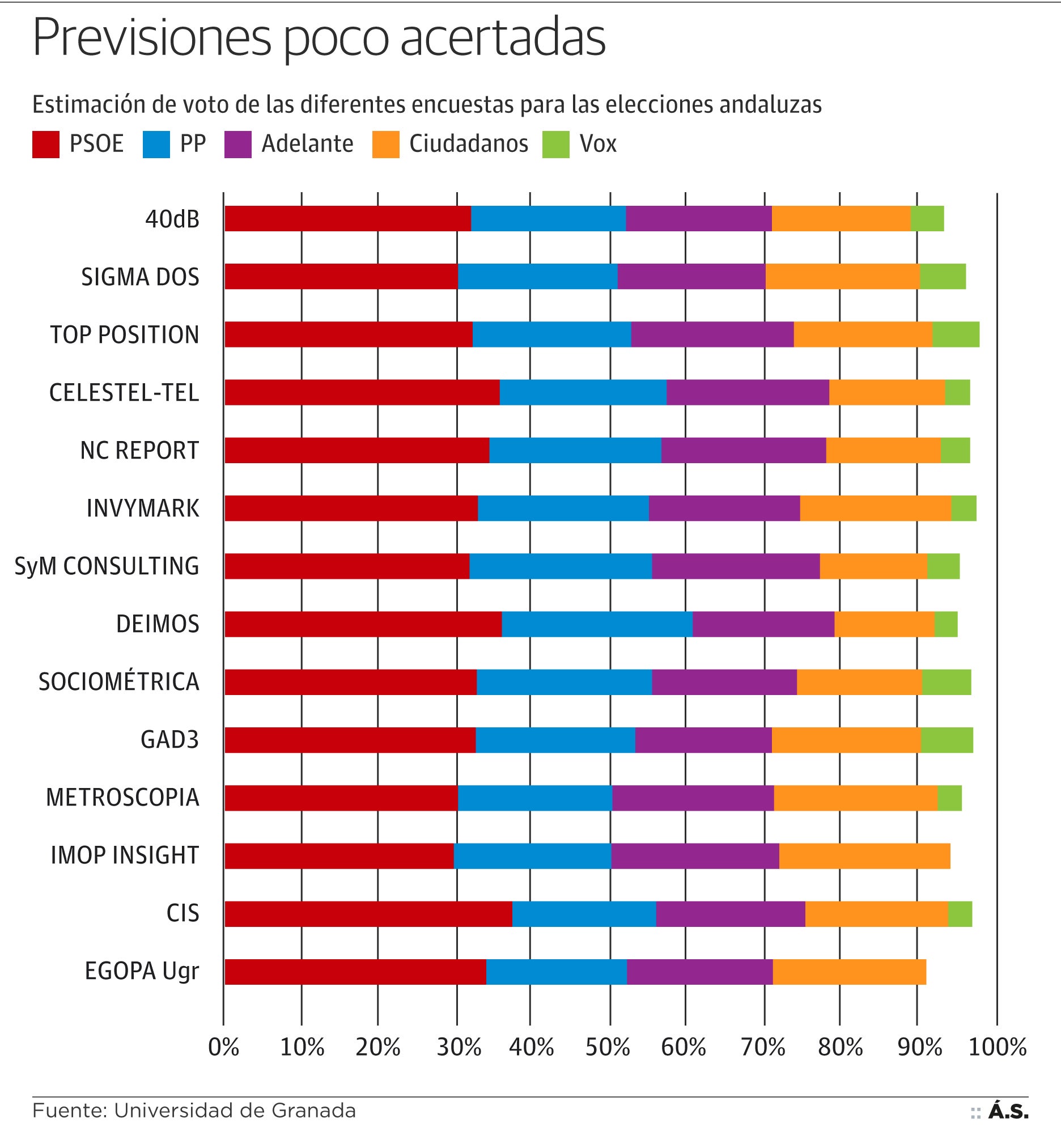 El auge de la ultraderecha, el factor más sorpresivo de las elecciones, solo fue visto por GAD3 (para ABC) que en su última entrega la misma noche electoral vaticinó entre 8 y 10 diputados frente a los doce que obtuvo). La irrupción de Vox (aunque ni mucho menos con esa fuerza) es el único mérito que se puede reconocer al CIS. Predijo a mitad de noviembre que podría entrar en el Parlamento, pero solo le daba un 3,17% de los sufragios, frente al 10,97% que finalmente ha obtenido. Ningún gran estudio de los publicados hasta la noche electoral (Aurea, Imop, CIS, Metroscopia, GAD3, Deimos, SyM, NC Report, Celeste, Top Position , Sigma Dos o Invymark, 40dB o Sociométrica) dio a Vox más de un 6'8%, aunque sí es cierto que conforme avanzaba la campaña todos los estudios mejoraban sus previsiones. Las grandes empresas apuntaban, con matices y con un arco amplio, al famoso triple empate entre PP, Ciudadanos y Adelante Andalucía. Y a mucha distancia, la ultraderecha.
