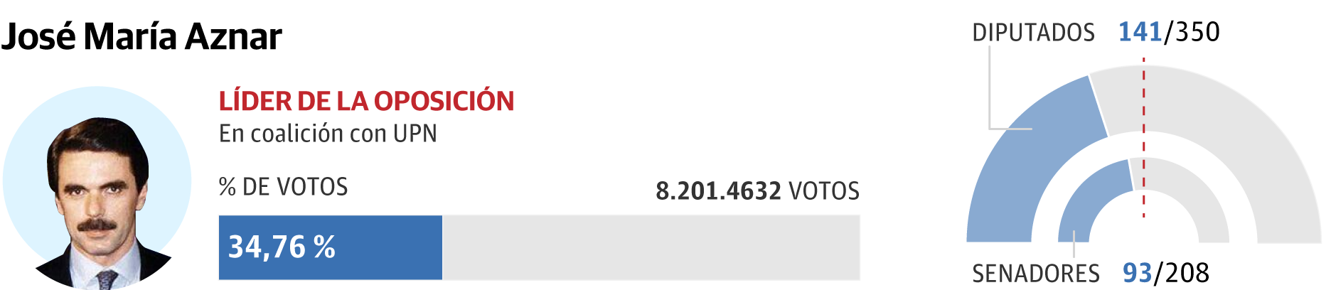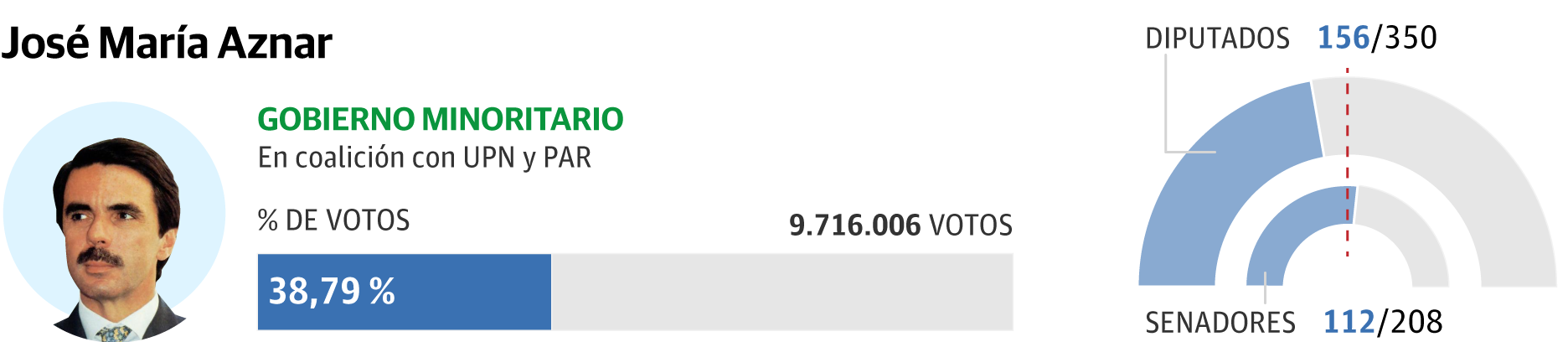 Aznar ganó por estrecho margen y tuvo que forjar una inédita alianza con CIU, PNV y Coalición Canaria. El PSOE pagó los casos de corrupción que afloraron en la anterior legislatura y el desgaste de 13 años de gobierno. IU logró los mejores resultados de su historia y los nacionalistas rentabilizaron su respaldo al PP con importantes concesiones.
