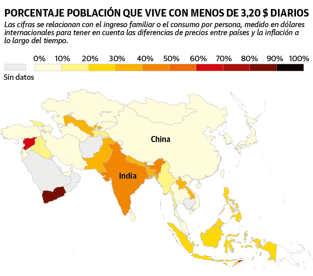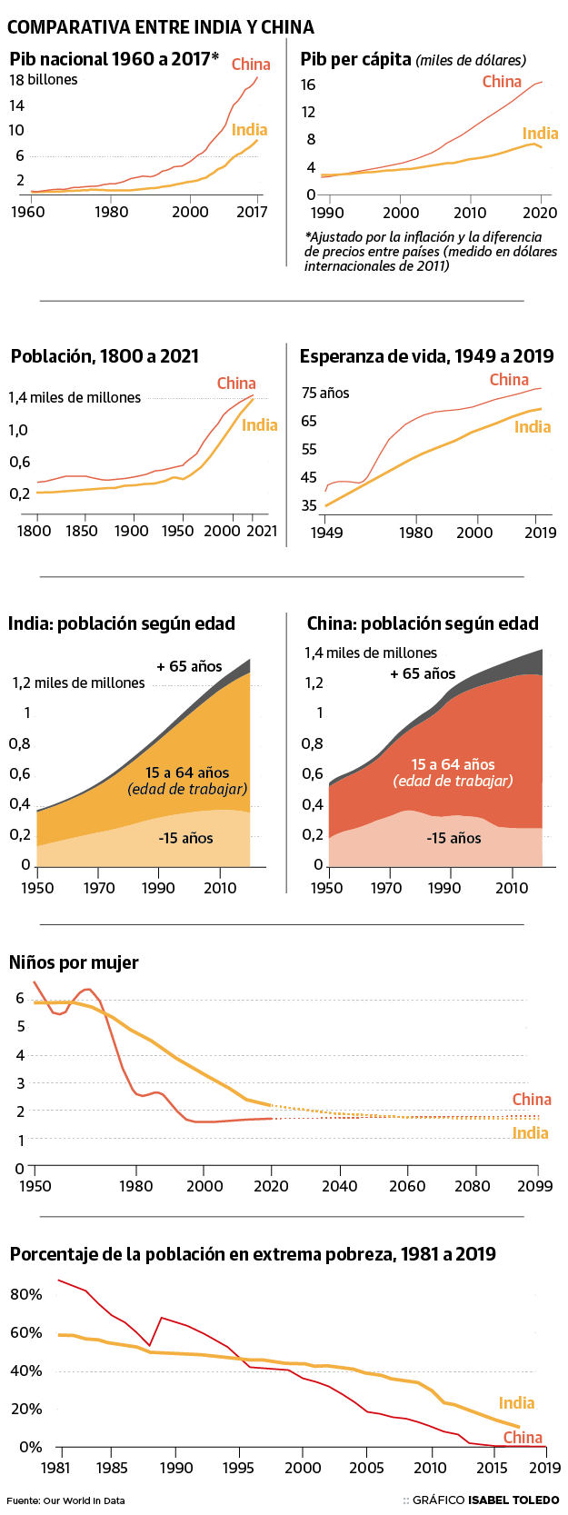 En 1961, el PIB de India y China era casi idéntico. Y, hasta la década de 1990, los ingresos de los indios superaban de media a los de los chinos. No obstante, tras las reformas que acabaron con el maoísmo a partir de 1979, China inició el meteórico despegue que embelesa al mundo. El año pasado China anunció el fin de la pobreza extrema y ahora su renta per cápita multiplica por cinco a la de India. Todos los indicadores sociales son también mucho más favorables al país comunista: desde los seis años más que viven sus habitantes, hasta la alfabetización casi total de su población –frente al 25% de analfabetos en India–, pasando por todos los indicadores de salud.