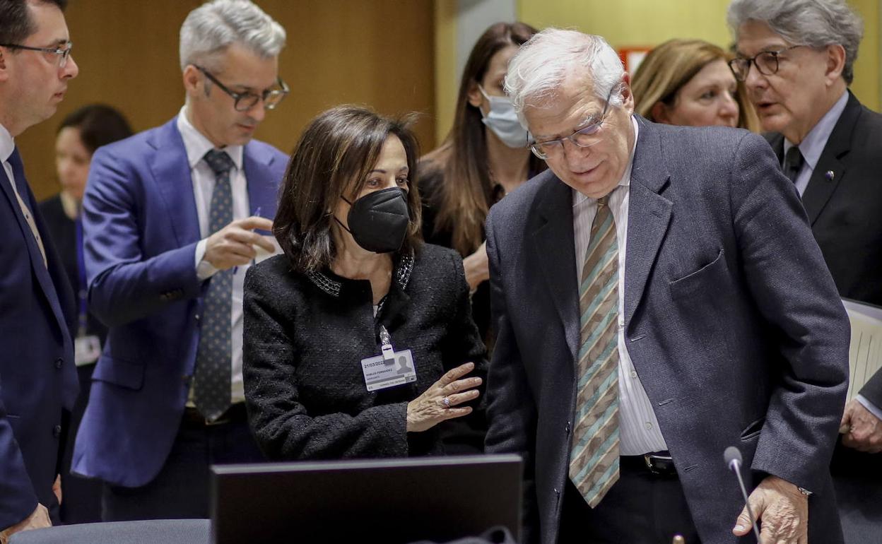 La ministra de Defensa, Margarita Robles, y el responsable de la pololítica exteriores de la UE, Josep Borrell, este lunes en Bruselas durante la reunión de ministros de Defensa y Exteriores comunitarios. EFE/Vídeo: Atlas