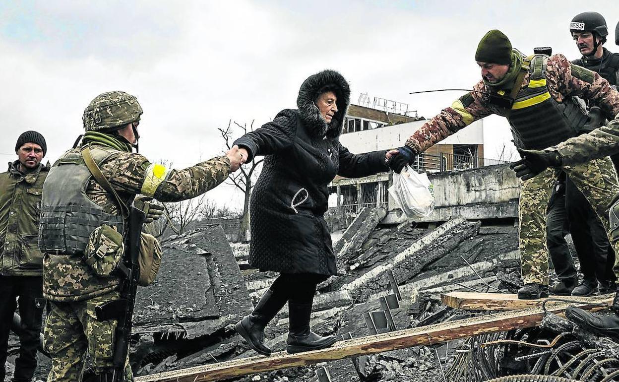 Los soldados ayudan a una mujer a cruzar sobre los escombros de un puente destruido a unos kilómetros de Kiev. efe