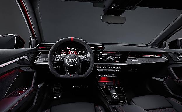 En el interior, cuenta con un cambio de marcha específico con visualizaciones propias en el cuadro de instrumentación digital Audi virtual cockpit plus (de 12,3 pulgadas). Dicho cuadro digital, por cierto, muestra las revoluciones en forma de gráfico de barras y , en porcentajes, la potencia y el par motor. El volante RS Sport, de tres radios, cuenta además con un botón específico para acceder a las prestaciones del RS Mode.