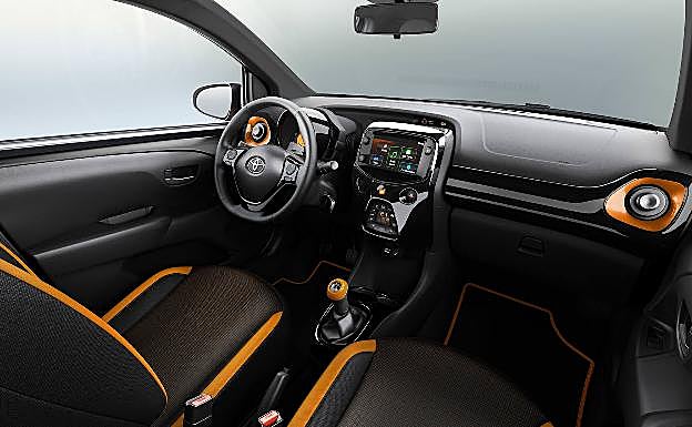En el interior, Aygo x-clusiv se distingue por su tapicería de cuero parcial, y el tono negro piano de la consola central, el salpicadero y el pomo de la palanca de cambios. Estos elementos contrastan con las salidas del sistema de climatización, en rojo, a juego con la carrocería.
