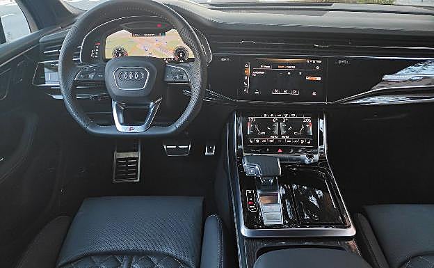 En el interior, el Audi Q7 hace gala de su posición de buque insignia. Abunda el cuero en el salpicadero, en los remates de las puertas y, por supuesto, en los asientos de ajuste eléctrico, que sujetan a la perfección el cuerpo (en nuestro caso eran los S plus, si bien aún hay una opción más confortable, los Confort, correspondientes con el nivel de equipamiento S Line). La disposición de tres pantallas (una el cuadro digital Audi Virtual Cockpit de 12,3 pulgadas, otra la del infoentretenimiento y mapas y una tercera para la climatización) resulta moderna, impactante y práctica. El gran inconveniente, tanto de ellas como de los remates en negro piano del salpicadero, es que son un verdadero imán de huellas.