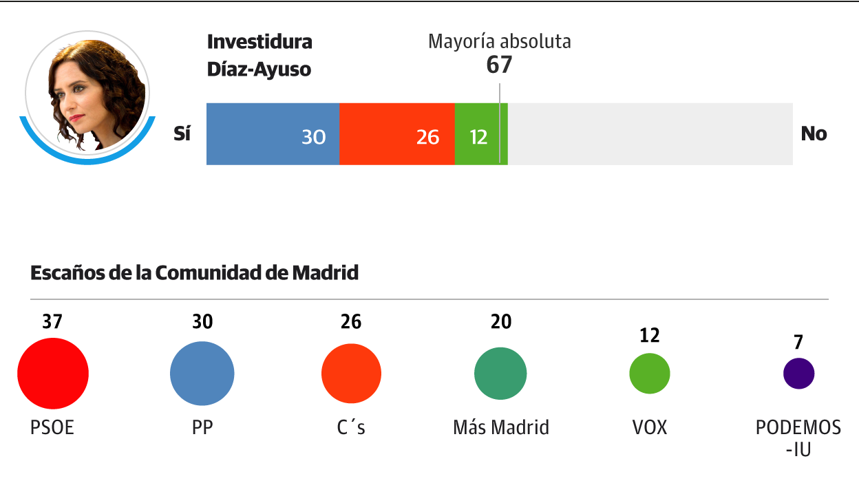 Pese a que en algún momento entre el martes y el miércoles hubo quien en el Partido Popular temió que Vox rehusara apoyar la investidura de Isabel Díaz Ayuso como presidenta de la Comunidad de Madrid, no hubo finalmente alteraciones en el guion. La candidata de los populares se esforzó por limar asperezas en la cuenta atrás para su elección y garantizó que cumplirá «en su totalidad» tanto el pacto programático suscrito con Ciudadanos, su socio de Gobierno, como el documento acordado con el partido de Santiago Abascal. El consenso se materializó pasadas las seis de la tarde en 68 votos a favor de su designación como representante autonómica que ponen en marcha una legislatura que incluso los suyos auguran «complicada».