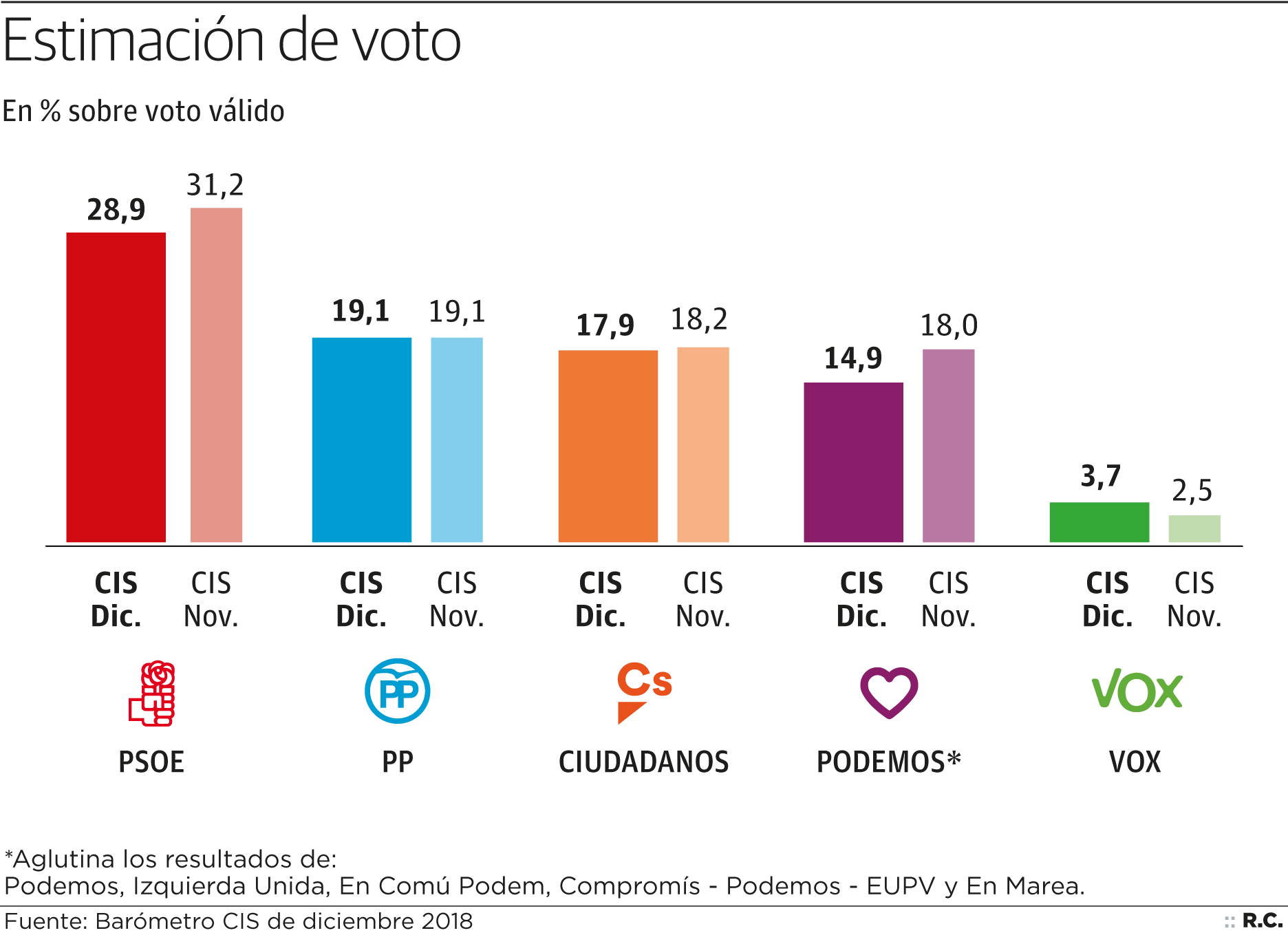 Los populares se estancan en el mismo 19,1% de los sufragios que le adjudicó la encuesta de noviembre. No obstante, hay una nota positiva. La formación presidida por Pablo Casado se afianza como segunda fuerza política, una posición por la que peleaba codo con codo con Ciudadanos hasta hace dos meses. Los liberales de Albert Rivera bajan tres décimas con respecto al anterior barómetro y cosecharían un 17,9% de los votos.
