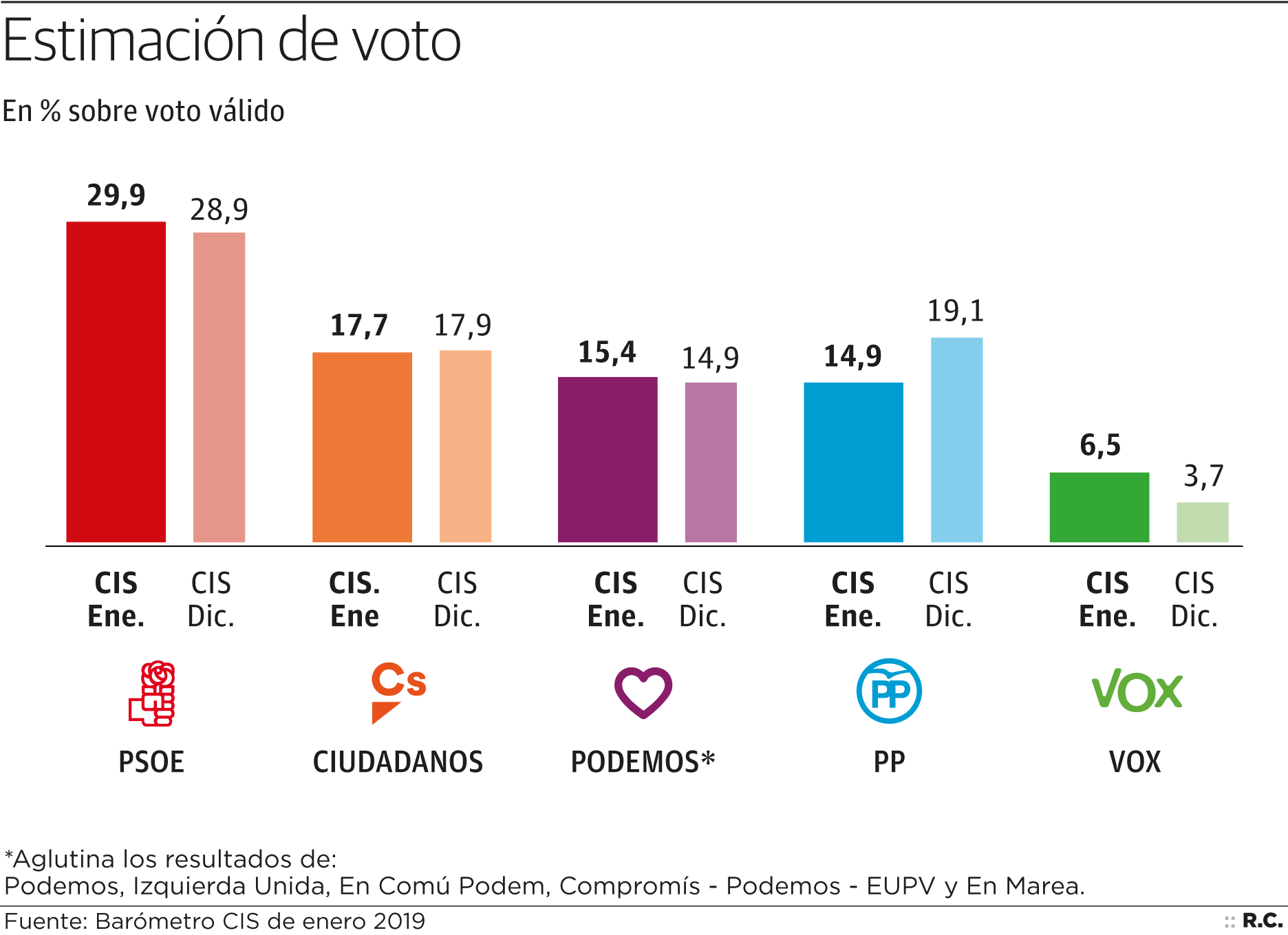 De acuerdo al barómetro, los socialistas ganan 1,1 puntos respecto a la encuesta de diciembre de 2018, mientras que los populares experimentan un fuerte retroceso de 4,2 puntos. El partido que lidera Albert Rivera también pierde dos décimas en intención de voto pese a escalar hasta la segunda posición. La formación que encabeza Pablo Iglesias sube medio punto, en tanto que el partido que capitanea Santiago Abascal incrementa en casi tres puntos su intención de voto.