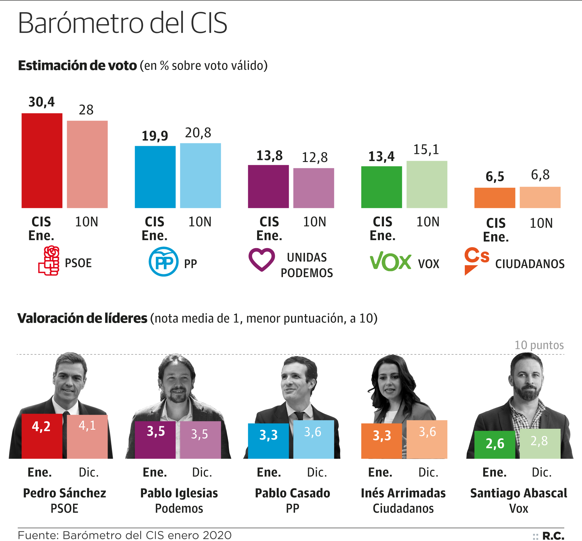 Pero el principal vuelco que arroja el estudio del CIS es la correlación de fuerzas entre bloques ideológicos. Si tras el 10 de noviembre el apoyo electoral de PP, Vox y Ciudadanos se situó en el 42,7% por un 41,6 de PSOE y Podemos; en enero, la izquierda tendría una estimación de voto del 44,2% y la derecha, el 39,8. Un cambio que socialistas y morados interpretan como un espaldarazo al Gobierno de coalición, mientras que en el terreno conservador se achaca a las «manipulaciones» del CIS desde que lo dirige José Félix Tezanos, miembro de la comisión ejecutiva del PSOE hasta que hace dos años fue llamado por Sánchez para presidir el centro demoscópico.