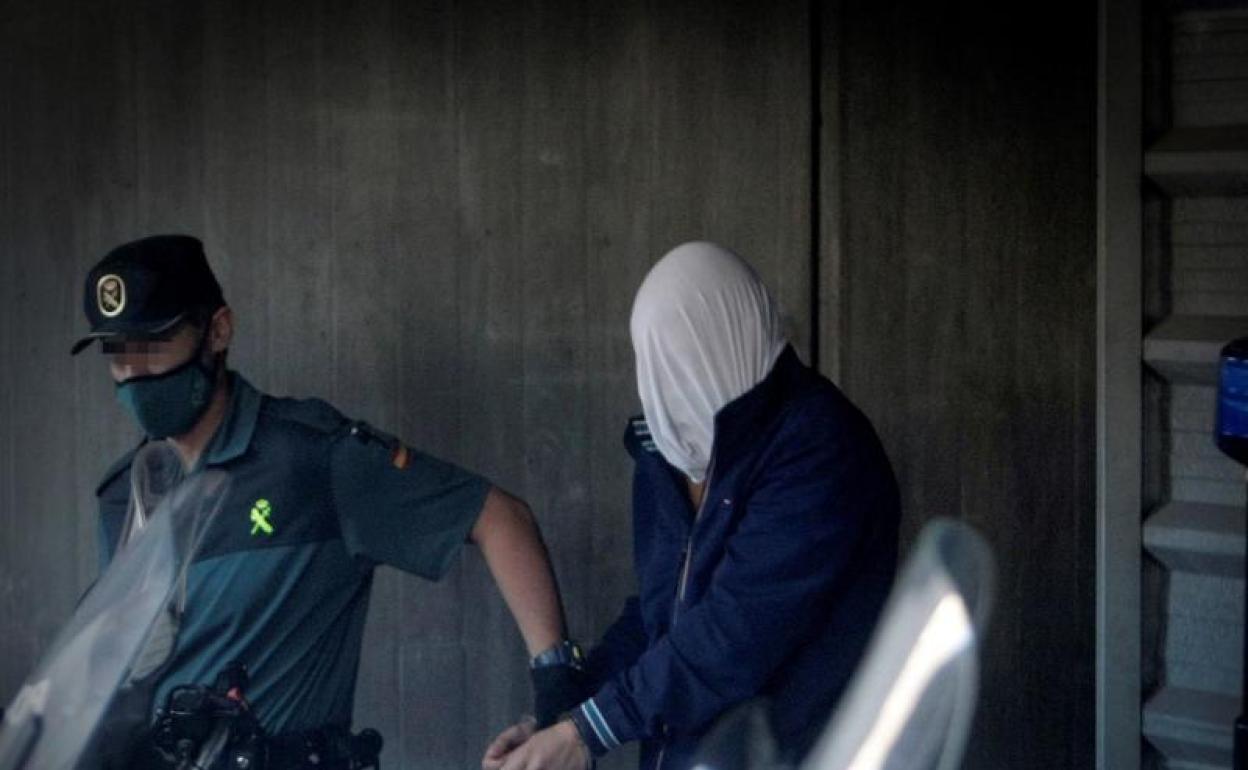 Uno de los presuntos culpables del asesinato de Samuel Luiz es conducido a un furgón de la Guardia Civil a su salida del juzgado de A Coruña. efe / Vídeo Altas