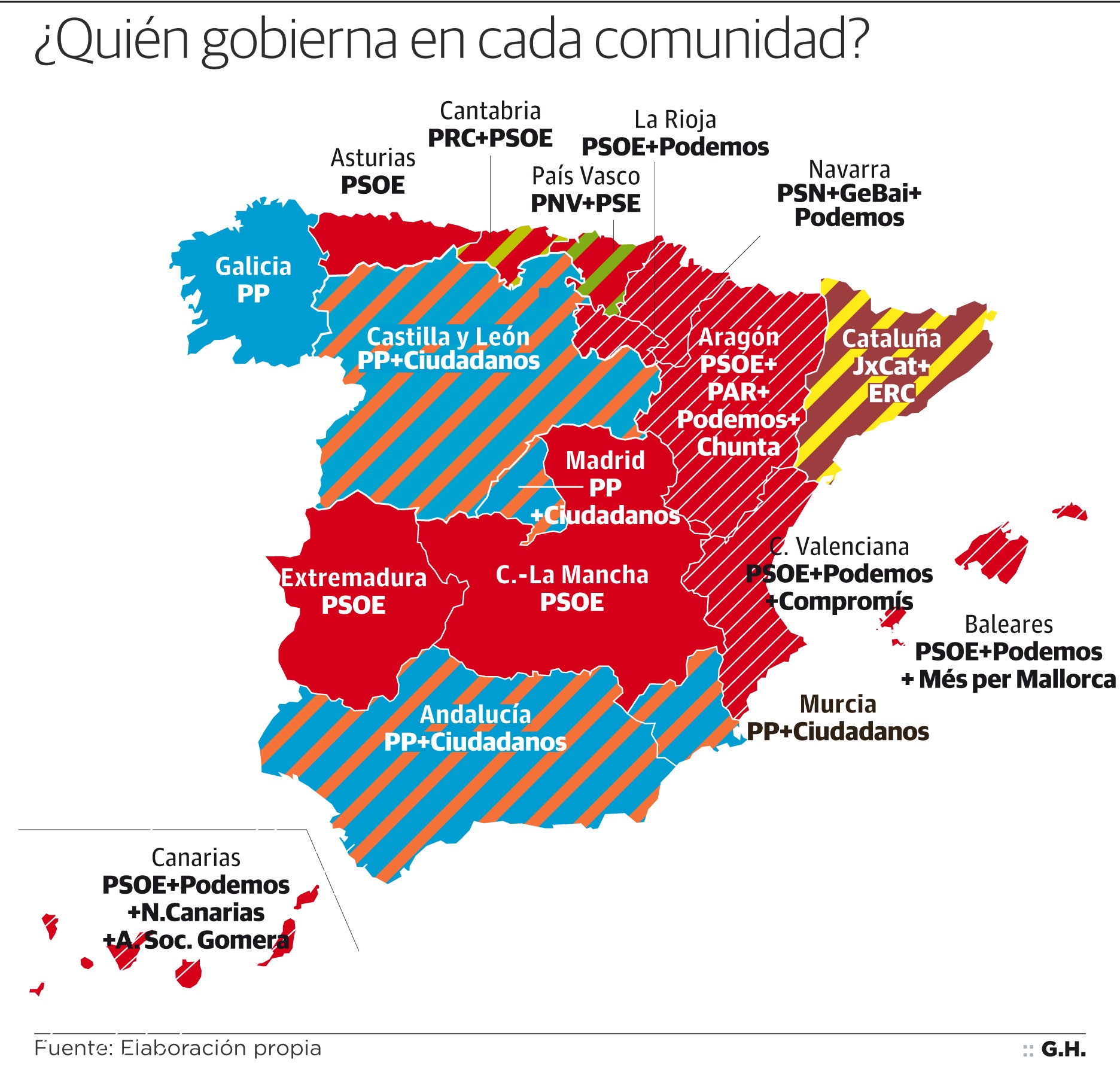 La primera vez que dos partidos se repartieron un Gobierno autonómico fue en 1986, cuando el PNV necesitó al PSOE para investir como lehendakari a José Antonio Ardanza. Tres décadas más tarde, socialistas y morados gobiernan de forma conjunta en Aragón, Baleares, Comunidad Valenciana y La Rioja, cuya coalición estuvo a punto de fracasar pese a que la formación morada solo contaba con una diputada regional. En Navarra, además, lo hacen junto a los nacionalistas de Bildu y de Geroa Bai. Y en Canarias, se le suman Nueva Canarias y la Agrupación Socialista Gomera.