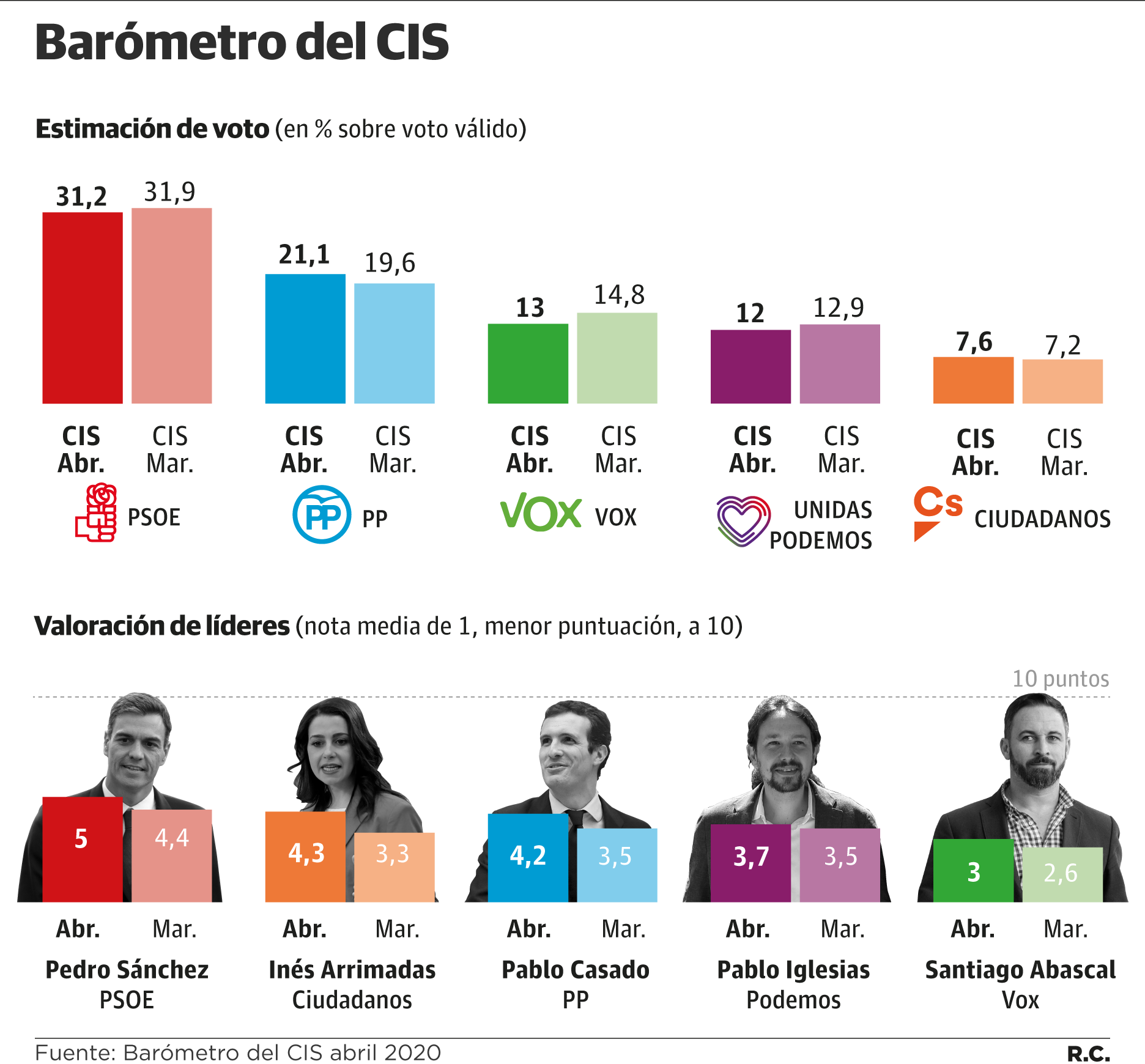 Al PSOE no le pasa factura la crisis del coronavirus, al menos según refleja la encuesta especial por la pandemia del Centro de Investigaciones Sociológicas (CIS), una institución que desde que se hizo cargo de ella el socialista José Félix Tezanos no ha estado exenta de la polémica. Los de Pedro Sánchez ganarían las elecciones con un 31,2% de los votos, siete décimas menos que en el anterior sondeo, pero aún tres puntos por encima de su resultado en las generales de junio.