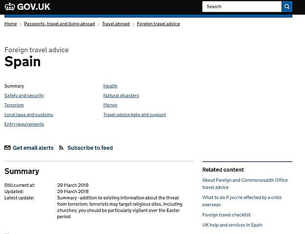 El departamento de Exteriores del Reino Unido ha lanzado a las 17.49 horas una alerta en su espacio de ‘avisos de viajes’ en la que asegura que es «probable que los terroristas intenten llevar a cabo ataques en España» coincidiendo con la Semana Santa.