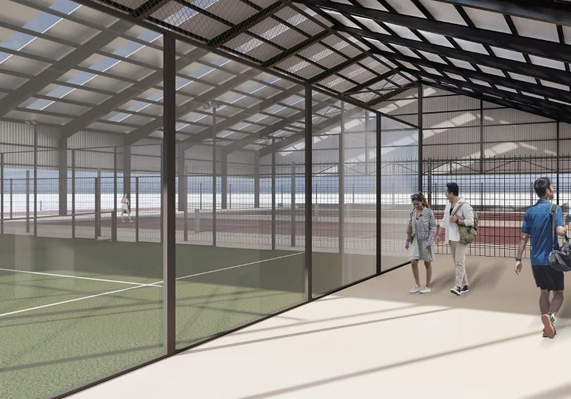 El objetivo es levantar una cubierta para las actuales pistas de tenis y el frontón además de renovar, reordenar, sumar una cancha de tenis y otra de pádel, vestuarios, almacén y cuarto de instalaciones, acondicionar el entorno y abrir una senda al oeste, protegida por el muro de contención del actual frontón, con suelo de hormigón impreso.