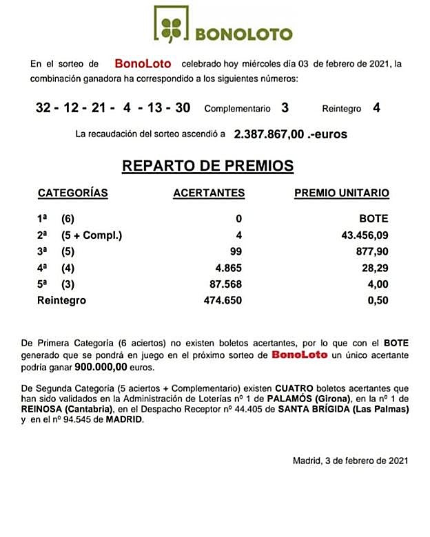 La combinación ganadera ha correspondido a los números 32-12-21-4-13 y 30, siendo el complementario el 3 y el 4 el reintegro.