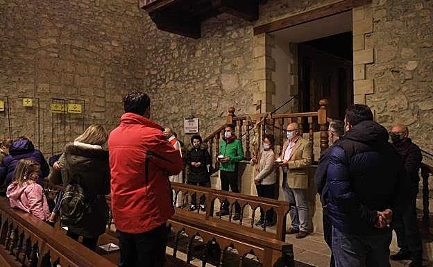 La primera estación se inició junto al altar, portando una cruz procesional los fieles, que en cada una de ellas se iban turnando, acompañados por el sacerdote y por dos personas que portaban una pequeña vasija con una vela encendida, mientras otra persona iba desinfectando las manos de la que, en cada momento, portaba la cruz procesional.