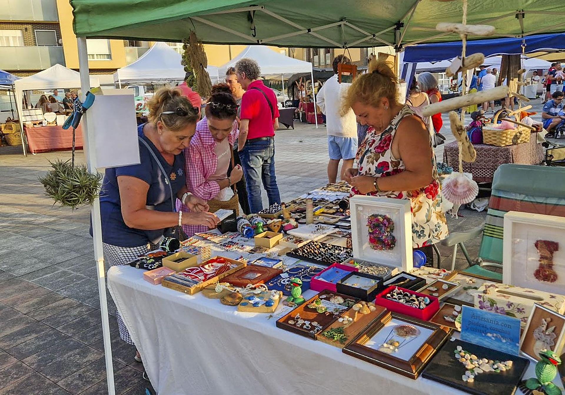 Los productos más variopintos se extienden por las mesas dispuestos cuidadosamente bajo sendas carpas a la que se van asomando quienes pasean por la plaza movidos por el interés hacia los libros, el calzado, los juguetes y un largo etcétera. Fé Vega vende minerales de colección, bisutería en minerales y artesanía. Se la puede encontrar en diferentes eventos del municipio, pero también recorre kilómetros para llegar a otros puntos como Torrelavega, Santoña y Noja. Junto a su familia, pasa el día, casi como si estuviera disfrutando de la fiesta al otro lado del stand. «Lo mejor es el ambiente», asegura. Mientras ella explica las propiedades de cada mineral, su marido, José Luis González, coloca las tallas que ha aprendido a hacer ya jubilado. «Grabando a láser en madera noble de Cantabria», explica.