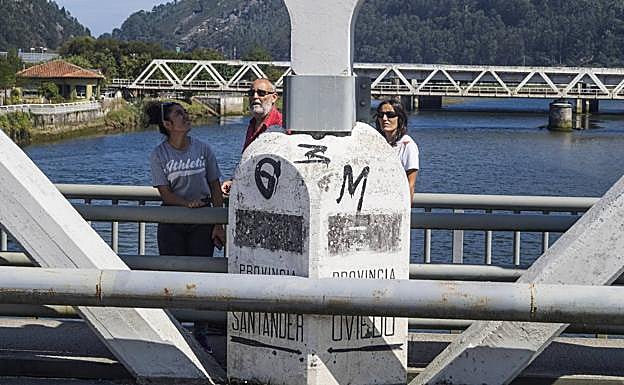 Peregrinos cargados con sus mochilas y enseres cruzan este puente a todas horas. El Camino del Norte se adentra en Asturias gracias a la pasarela que lleva a los feligreses a Bustio. A la entrada del puente se encuentra un cartel con el mapa del Camino y observándolo está Begoña Mendiolea y su pareja, que vienen de Bilbao. Este matrimonio sí conocía que el límite se encuentra en el centro del puente. «Hoy no pasaremos, pero ya lo hemos hecho otras veces porque es curioso. Siempre que vamos o venimos de Potes paramos aquí», indica.