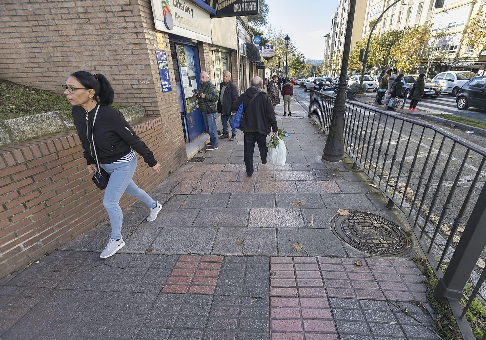 Sirvan las fotos que acompañan este texto. La de la entrada a la farmacia junto al paso de cebra de la Plaza de Toros o la del suelo que rodea la parada de autobús. Una acera a base de pegotes desgastados (y resbaladizos, que ya ha habido alguna caída), desconchones, desniveles o baldosas de esas que 'escupen' cuando ha llovido. No falta de nada.