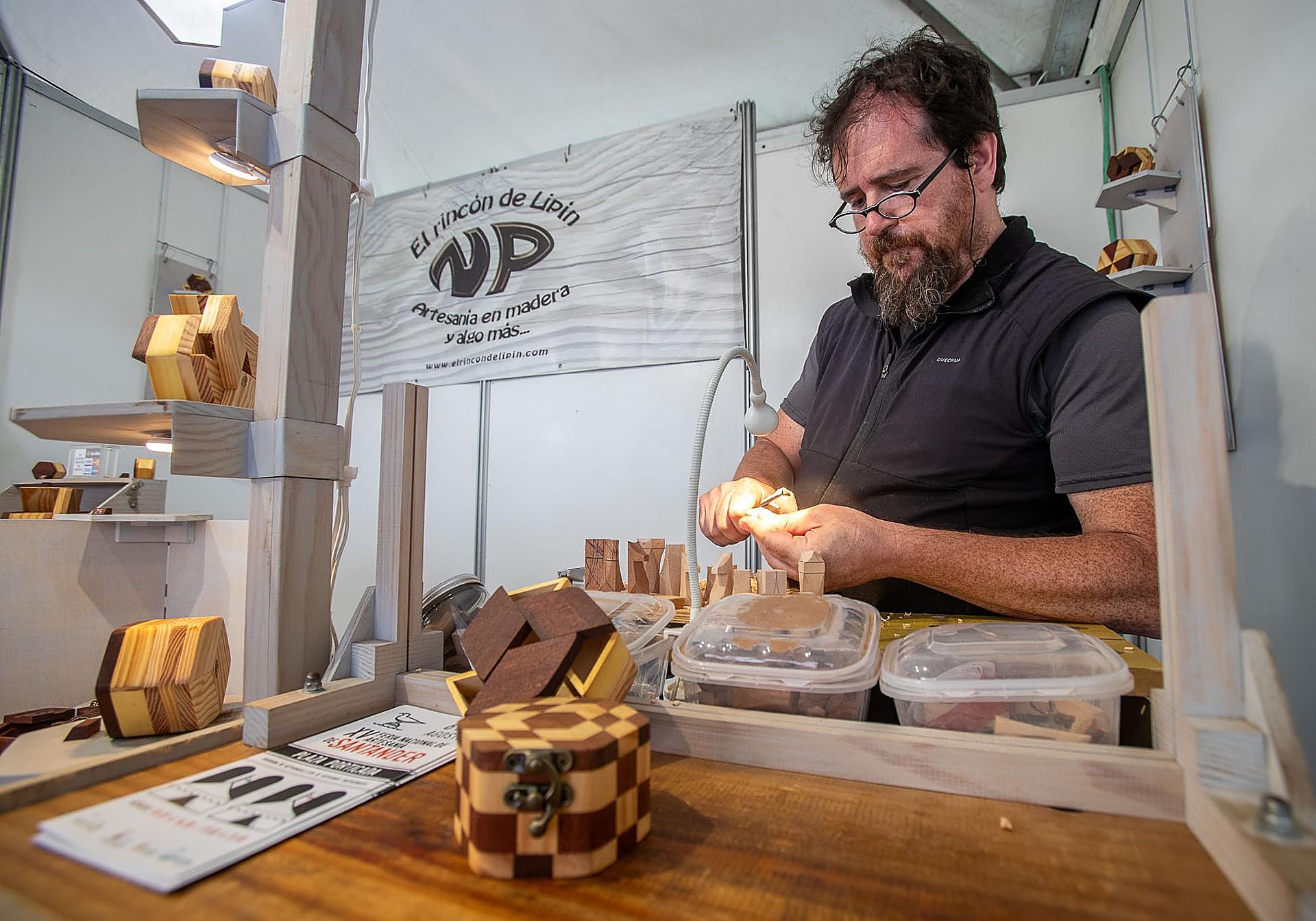 Uno de los 34 puestos instalados en la Plaza Porticada atrae especialmente por el inconfundible olor a madera recién tallada. Ese aroma guía a los visitantes hasta 'El Rincón de Lipín', el taller de Nacho Pellón, un artesano cántabro que ha hecho de los juegos su gran especialidad.