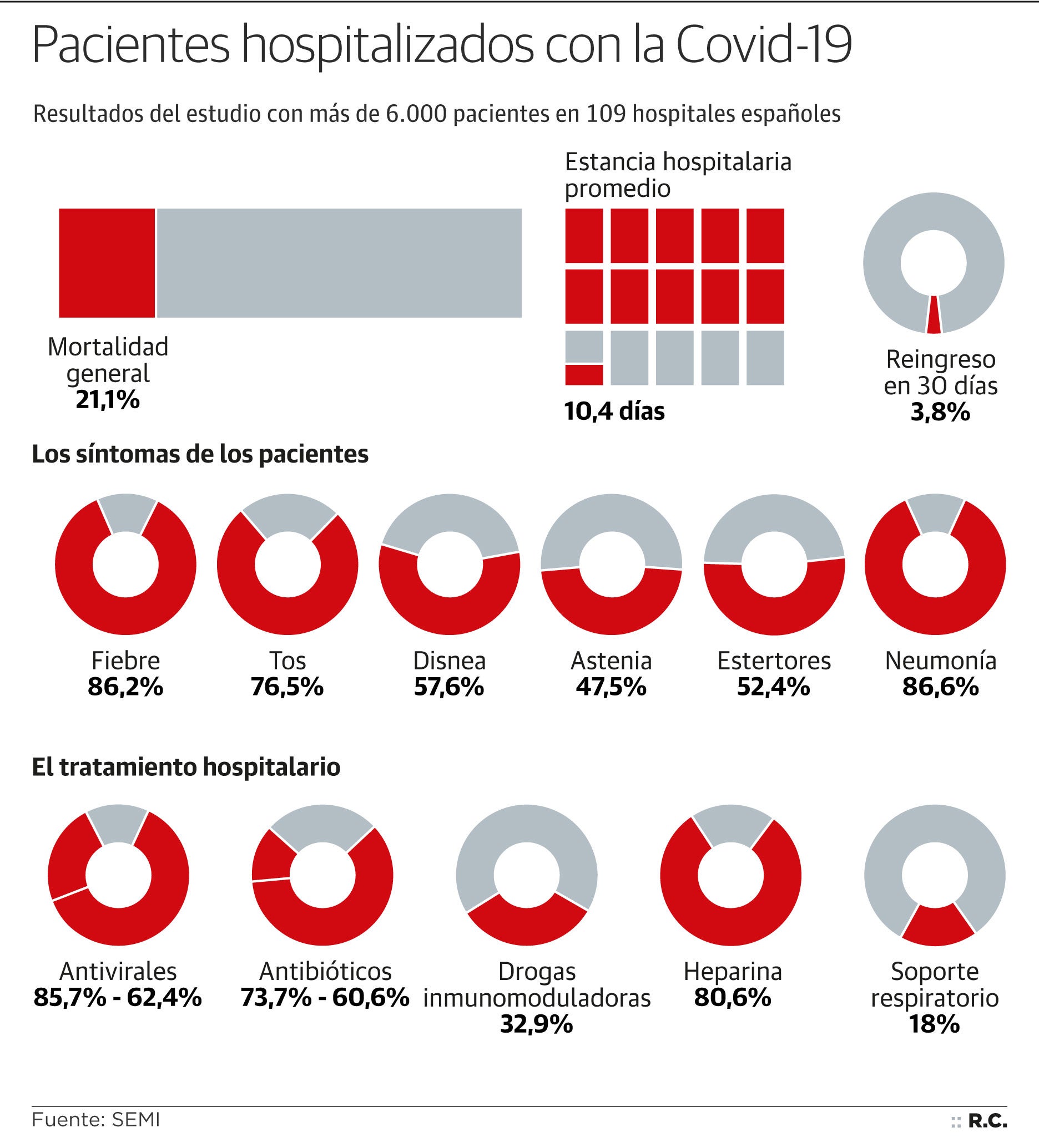 Esta «completa radiografía», elaborada por la Sociedad Española de Medicina Interna (SEMI) con pacientes que ingresaron de forma consecutiva, establece que la tasa de mortalidad general fue del 21,1%. Con los datos actualizados hasta el 30 de abril, los porcentajes de mortalidad del estudio de la SEMI son mayores que los despejados por los datos de Sanidad, de alrededor del 11% entre los pacientes «confirmados» según su criterio.
