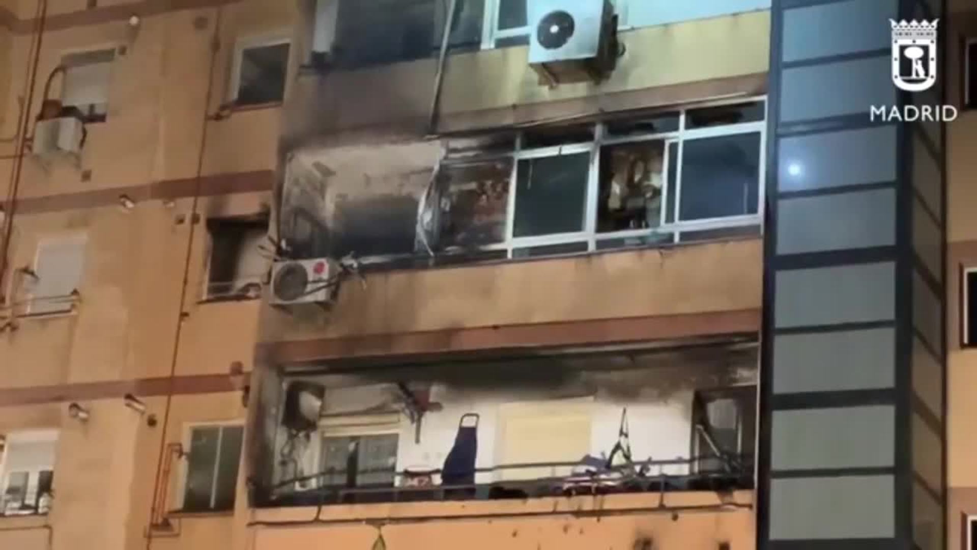 Efectivos de Samur-Protección Civil han atendido esta tarde a tres menores por inhalación leve de humo a causa de un incendio originado en una vivienda del distrito madrileño de Usera. Las llamas han afectado también a las terrazas de los dos pisos de arriba y los Bomberos continúan trabajando en el lugar.(Fuente: Emergencias Madrid)
