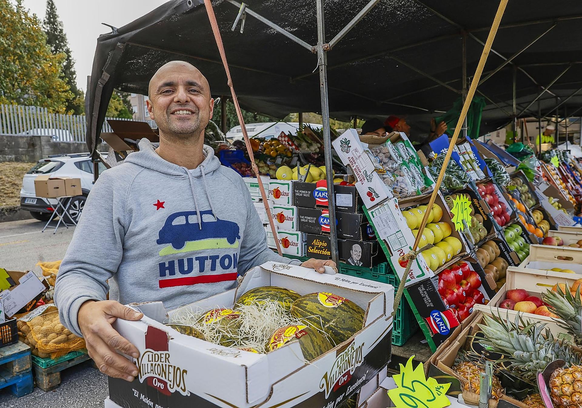 Al otro lado de uno de los mostradores más coloridos del Ferial, Manuel Ángel Ruiz y su equipo venden fruta sin parar. Y eso que el día salió «un poco malo» ayer con lo del viento, sobre todo al inicio de la mañana. Manuel es otro que lleva décadas en esto, tirando del carro de Más que Fruta, una empresa con local en Solares. «Cuarenta años llevo viniendo a Torrelavega. Venía de crío para ayudar a la familia y vendemos muy bien aquí», declara, antes de describir octubre como un mes más bien flojo en el calendario: «Luego noviembre recupera y diciembre mejor todavía. Después viene la fresa, etc.»