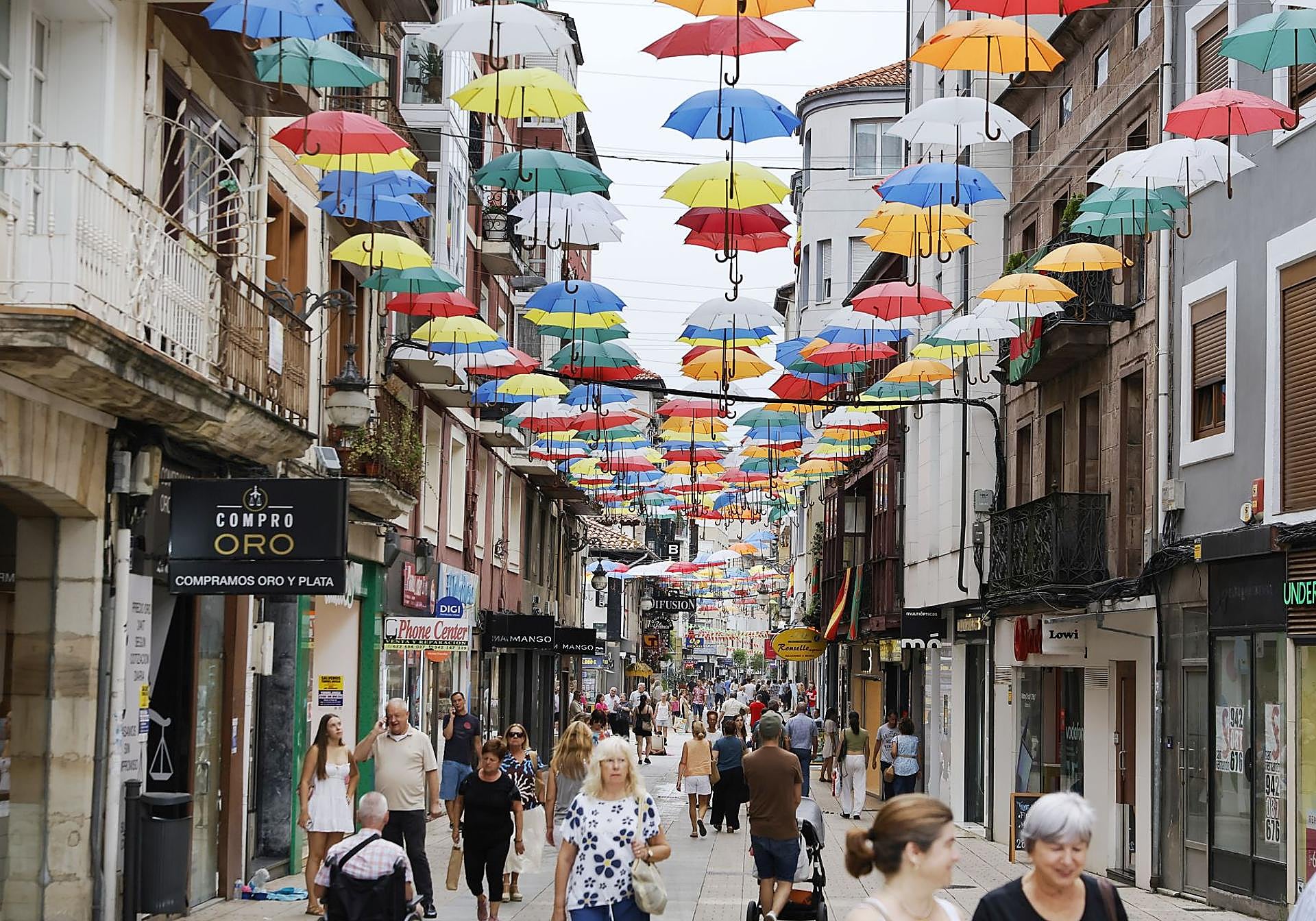 La iniciativa, comenzó hace tres años en la también céntrica Joaquín Hoyos, pero ha terminado consolidándose en la de Consolación. Aquí, en pleno corazón comercial de Torrelavega, los paraguas de colores refrescan la postal del centro de la ciudad al tiempo que hacen sombra en estos días de bochorno. Ayer, además, cumplieron su función de toda la vida, durante el chaparrón que cayó durante la tarde. Decoran, protegen, hacen sombra y atraen a turistas. No en vano la iniciativa es de la Concejalía de Turismo del Consistorio.