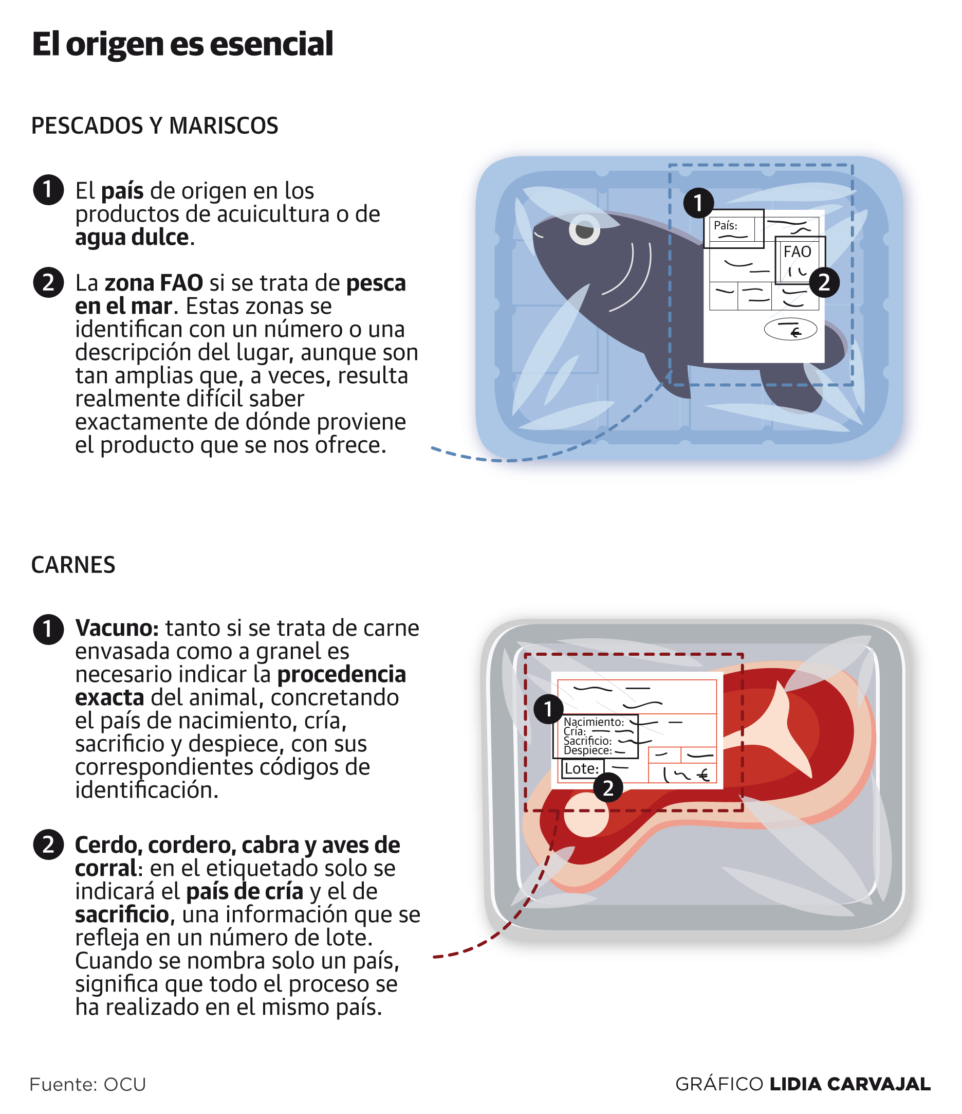 Explican en la OCU que en el caso de las carnes solo es obligatorio indicar el origen cuando es envasada, «salvo si es ternera, que hay que especificar el país de nacimiento, de crianza y de sacrificio». El problema y uno de los «incumplimientos más habituales en el etiquetado de las carnes es alegar un origen 'nacional' sin especificar el lugar concreto de procedencia», tal y como se exige por ley. «También resulta llamativo que en un país productor de carne como es España, que podría ser perfectamente autosuficiente, se encuentre pollo de Brasil o cerdo de Portugal», destacan los autores del estudio.