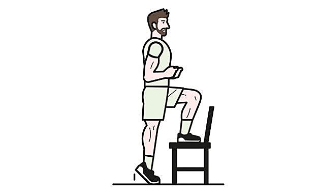 Ponte de frente a la silla, con las piernas separadas al ancho de las caderas. Apoya firme el pie derecho en el centro del asiento. Levanta el talón izquierdo poniéndote de puntillas. Aguanta arriba medio segundo y baja poco a poco controlando el movimiento. Antes de que el talón toque el suelo, vuelve a subirlo. Cambia de pierna.