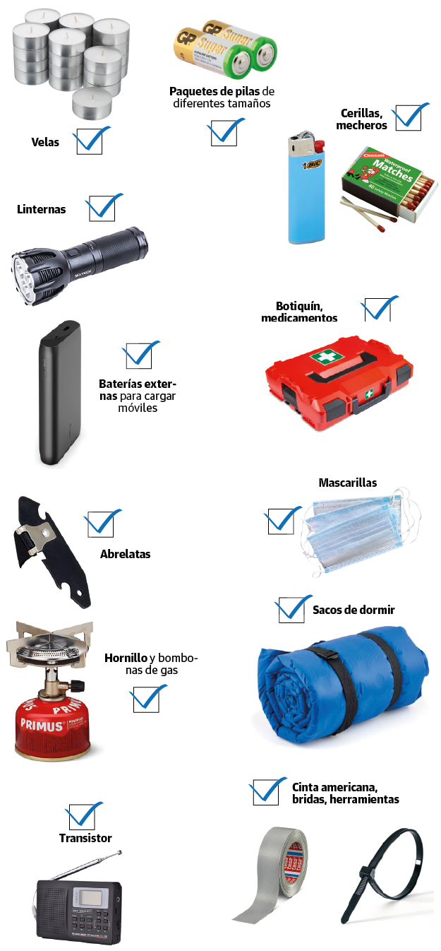El experto destaca que el agua es «totalmente imprescindible» y que si no hay electricidad «no funcionarían depuradoras ni bombas de agua que suministran a las viviendas». Hay que calcular dos o tres litros por persona más la que se va a utilizar en limpieza, aseo y cocina. Destaca también que los portátiles y móviles no podrían recargarse en una situación de corte de suministro, por lo que habría que contar con baterías externas, además de pilas, velas, encendedores... «Las velas son esenciales para una iluminación económica y duradera».