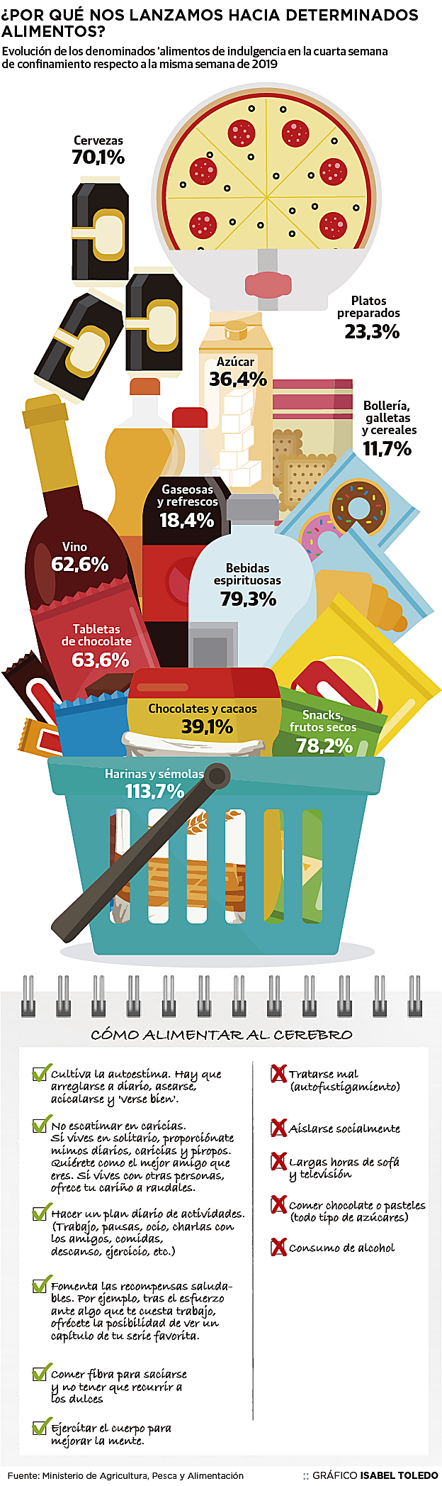 El hecho de que la cesta de la compra se haya llenado de caprichos no es una impresión: lo constatan los datos del Ministerio de Agricultura y Alimentación. En ellos se ve el incremento en las ventas con respecto al año anterior y cómo ha evolucionado a lo largo del estado de alarma. Así, cuando tocábamos la cuarta semana de encierro, y después de que la gente acopiase legumbres, arroces, pastas y otros alimentos no perecederos al principio, el incremento de ventas se dio en 'snacks' y frutos secos (un 78% de incremento), en tabletas de chocolate (un 63%) y en harinas, con un 113% más de lo que se vendía en una semana normal del año anterior. La consultora Nielsen constataba en otro estudio que el 57% de la población se ha dedicado, no ya al pan, sino a la repostería casera durante el confinamiento. La estadística del Ministerio arroja otro dato inquietante: la venta del total de bebidas espirituosas subió casi un 80% y la de la cerveza un 70%. Pero el consumo de alcohol merece capítulo propio.