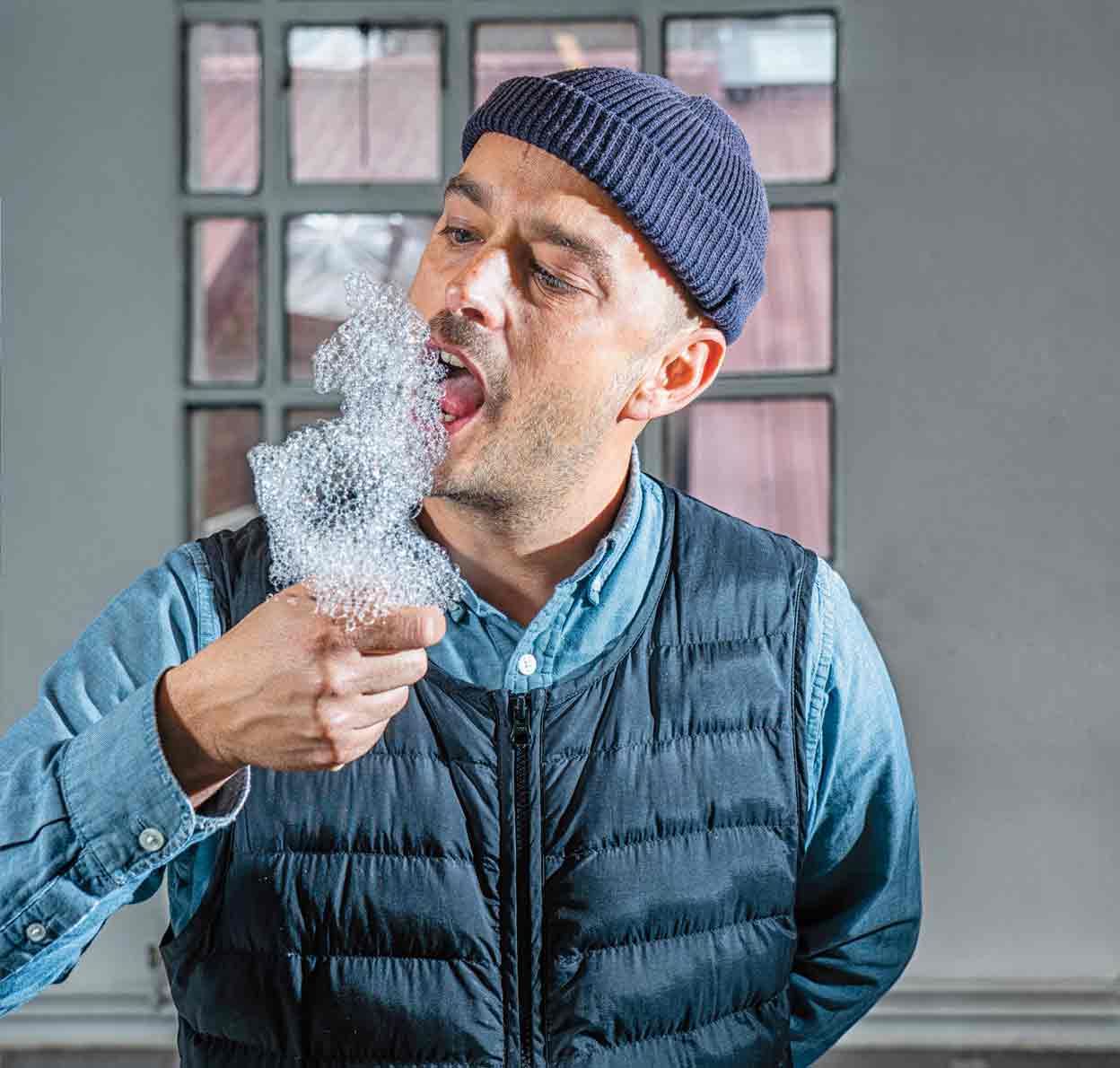 Locuras comestibles. El bombón volador, uno de los tempranos experimentos de Juan-Creix,  aún en pruebas. Desafía a la gravedad y cambia la voz de quien lo come: está elaborado con helio y argón.