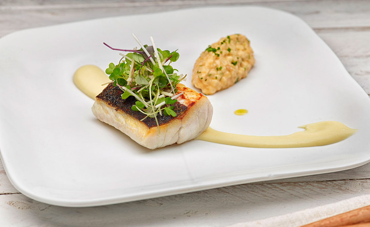 Se mantiene la piel del pescado -le da mucho sabor- y se salpimientan los lomos de lubina con 15 minutos de antelación. En una sartén con una pizca de aceite se asan por la piel, tostándola y terminando por la cara opuesta, hasta que queden en un punto nacarado.