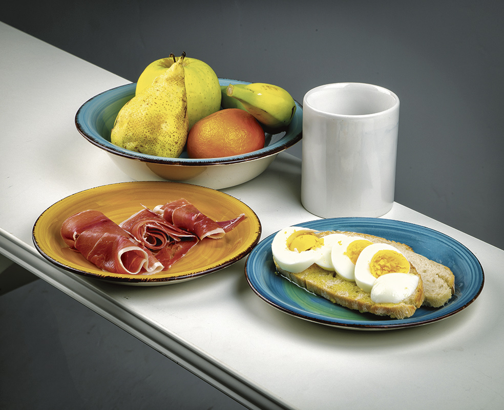 «Un plato de fruta y una tostada integral con aceite de oliva y un huevo duro. Una taza de leche semidesnatada caliente con semillas, y algo de jamón ibérico».